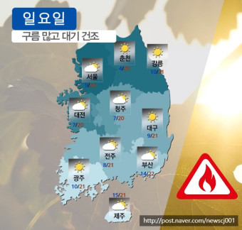 중부지방과 전라권서부에는 눈이 쌓여 빙판길과 도로에 살얼음이 생기는 곳도 많겠습니다. 동쪽 지역 곳곳에는 건조특보가 이어지면서 대기가 건조합니다. 강한 바람까지 더해지므로, 작은 불씨에도 각별히 주의하세요.
